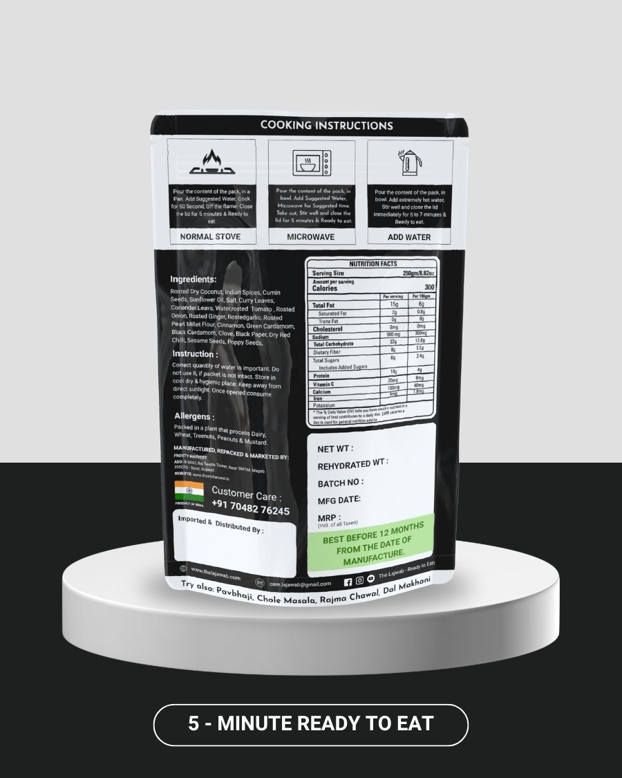 ROASTED DRY COCONUT, INDIAN SPICES, CUMIN SEEDS, SUNFLOWER OIL, SALT, CURRY LEAVES, CORIANDER LEAVES, WATER, ROASTED TOMATO, ROASTED ONION, ROASTED GINGER, ROASTED GARLIC, ROASTED PEARL MILLET FLOUR, CINNAMON, GREEN CARDAMOM, BLACK CARDAMOM, CLOVE, BLACK PEPPER, DRY RED CHILLI, SESAME SEEDS, POPPY SEEDS