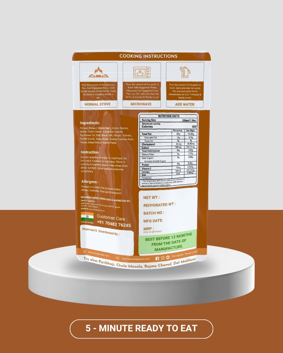 Paneer, Butter (Milk & Salt), Indian Spices, Water, Fresh Cream, Coriander Leaves, Sunflower Oil, Salt, Black Salt, Ginger, Tomato, Bottle Gourd, Rose Water, Honey, Cashew Nuts Paste, Watermelon Seeds Paste